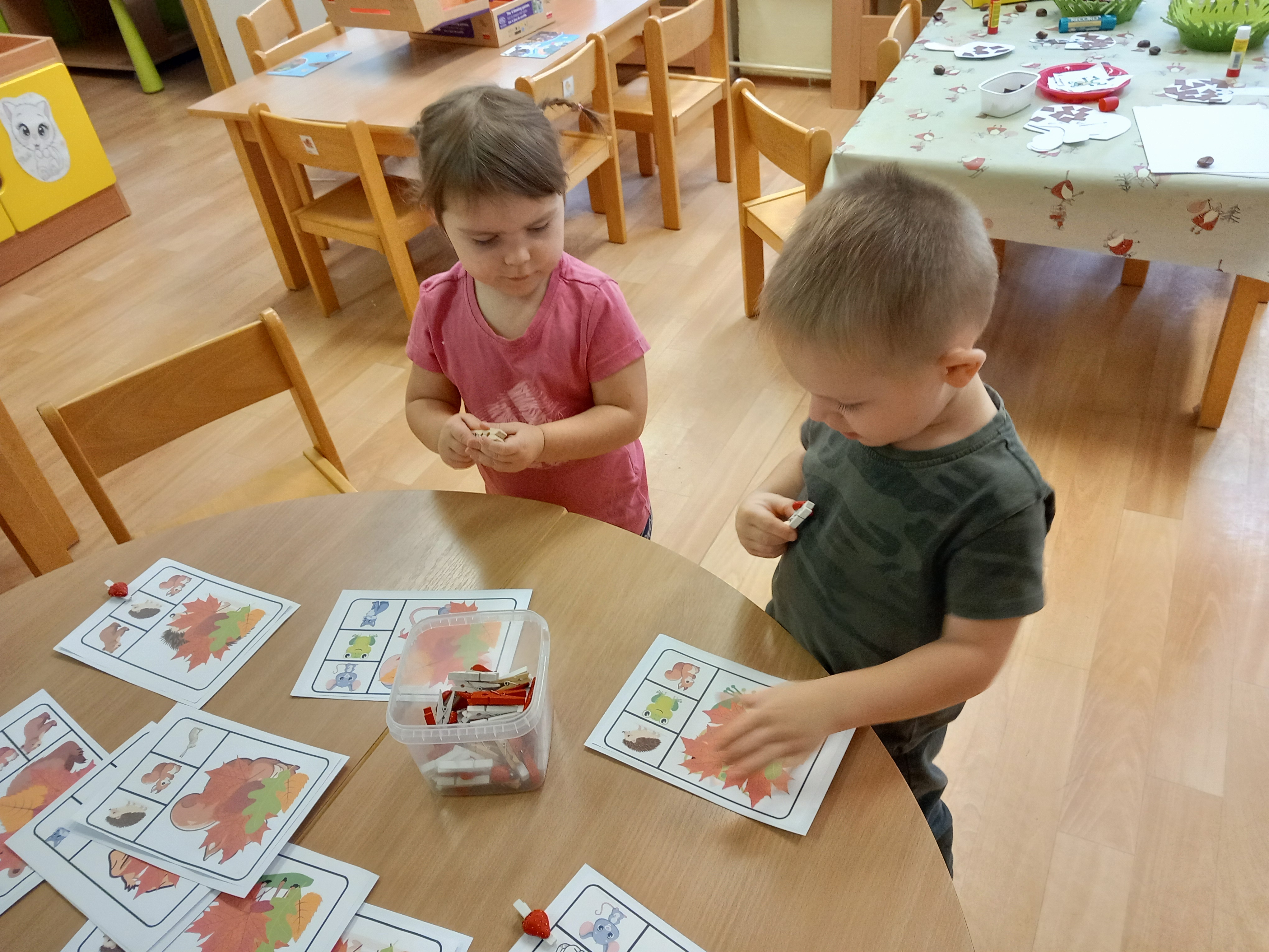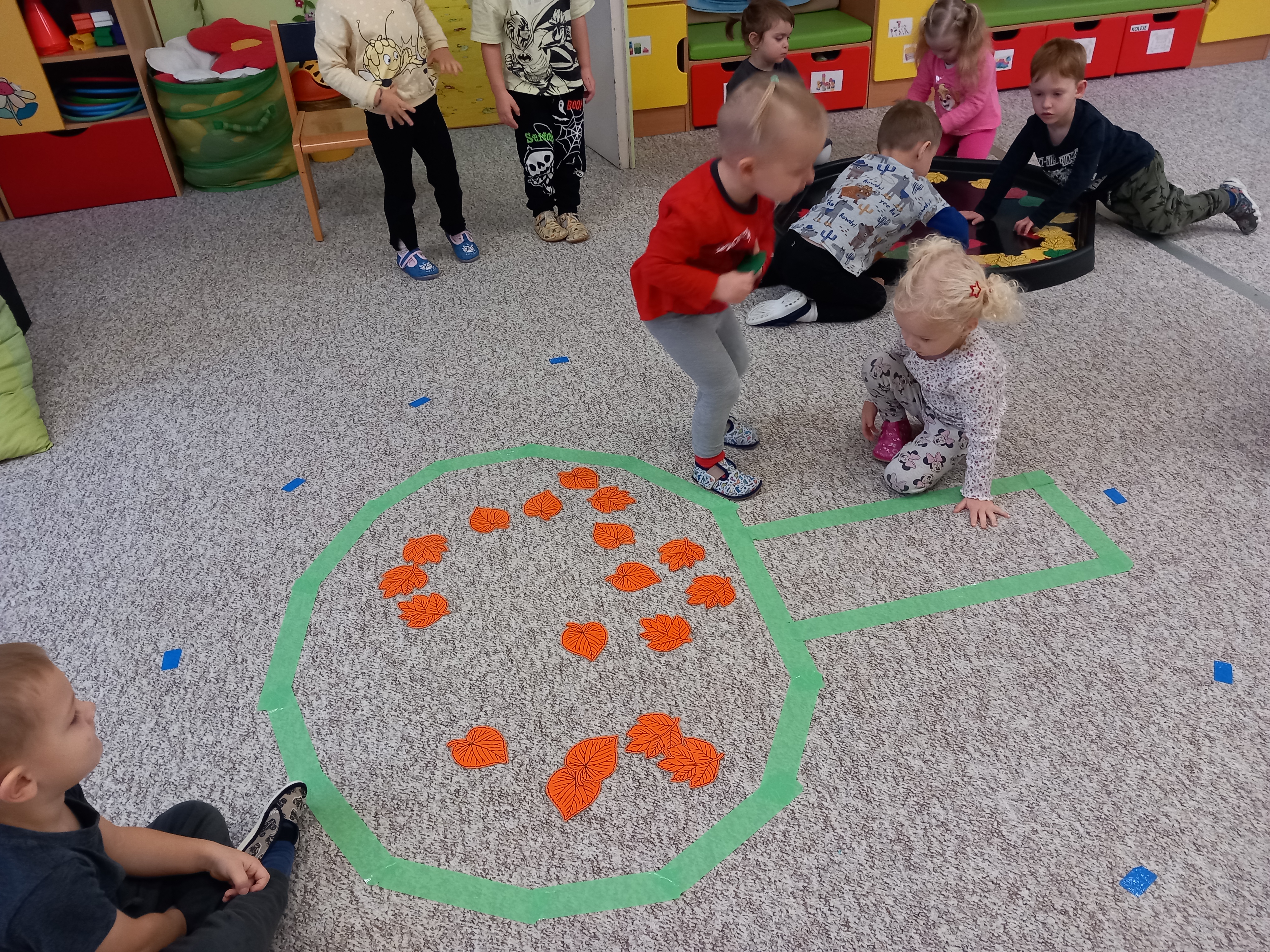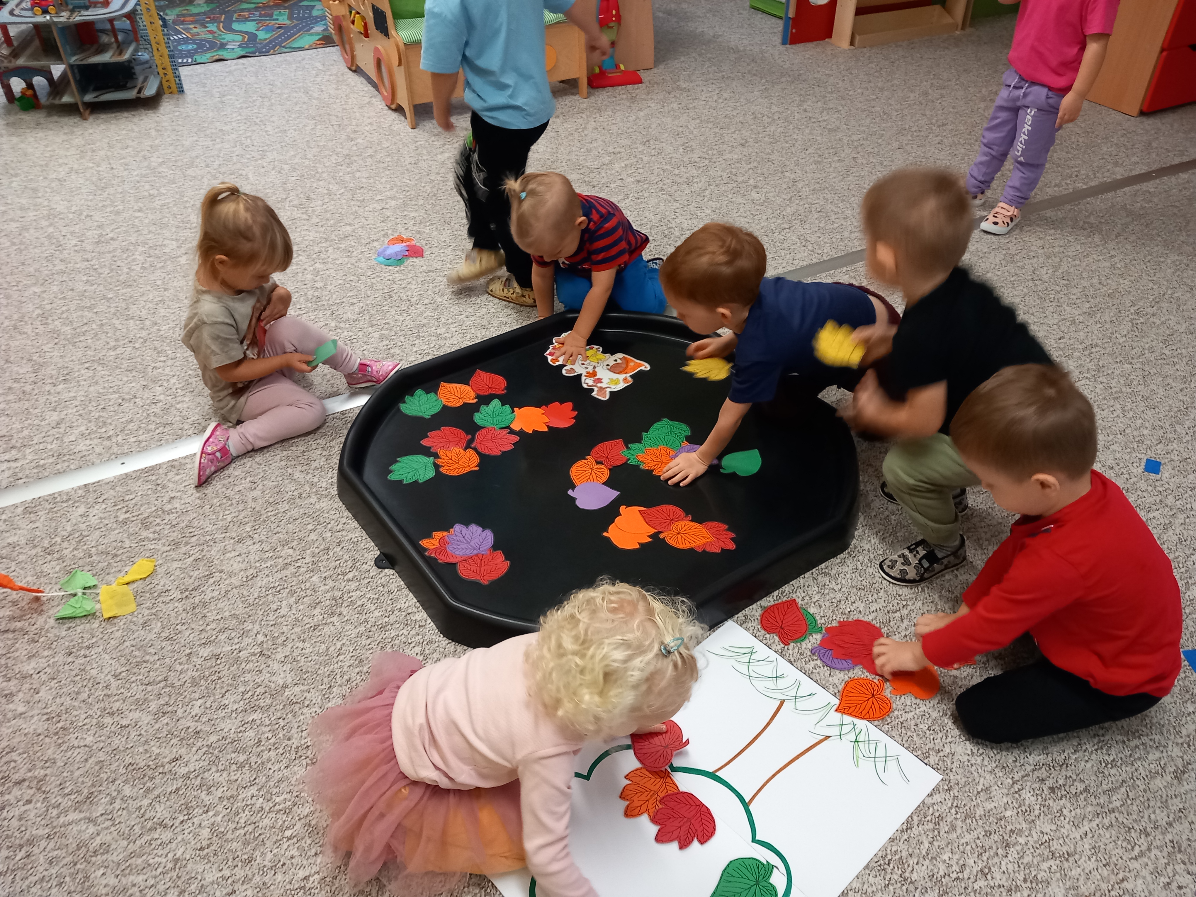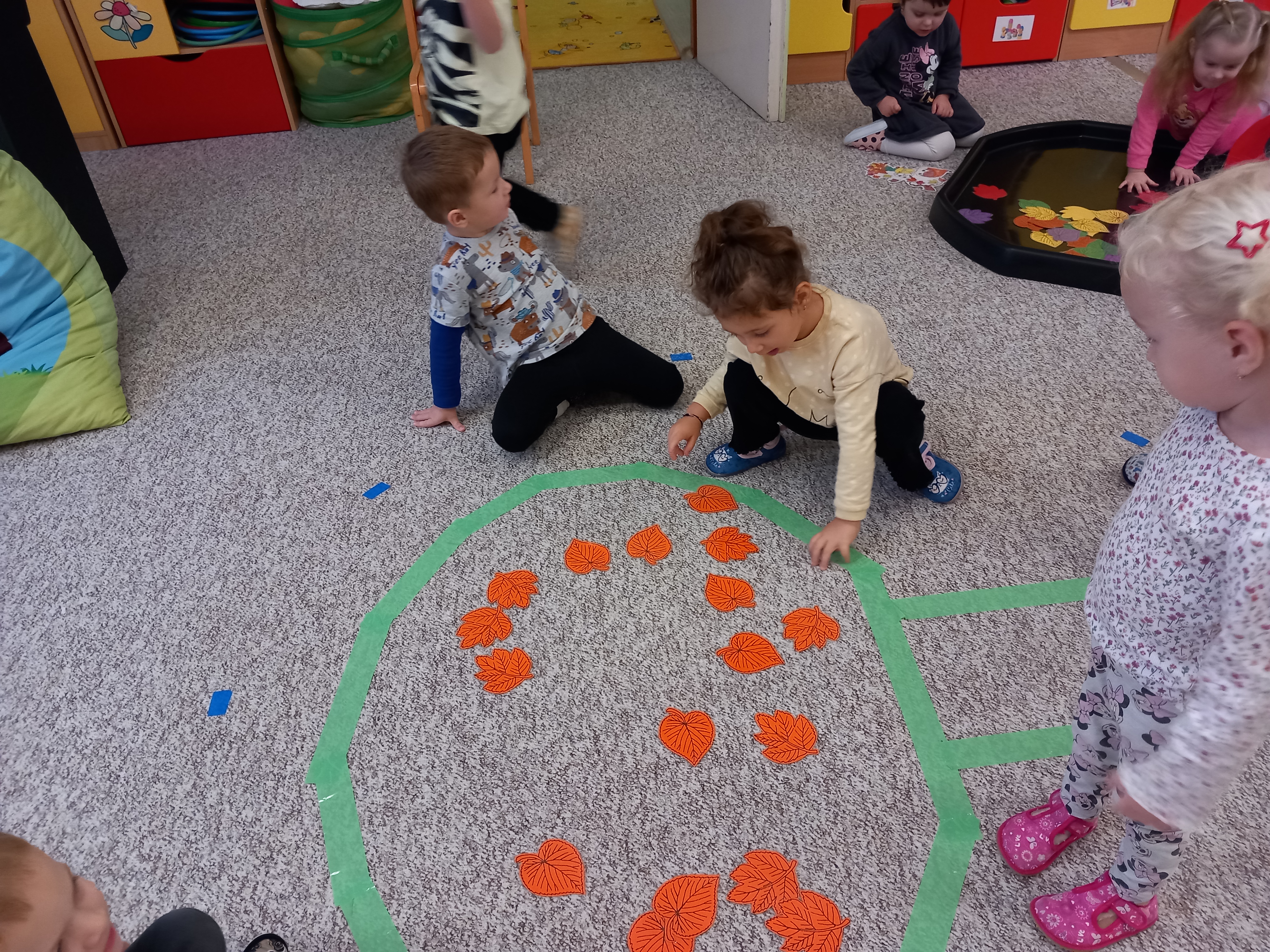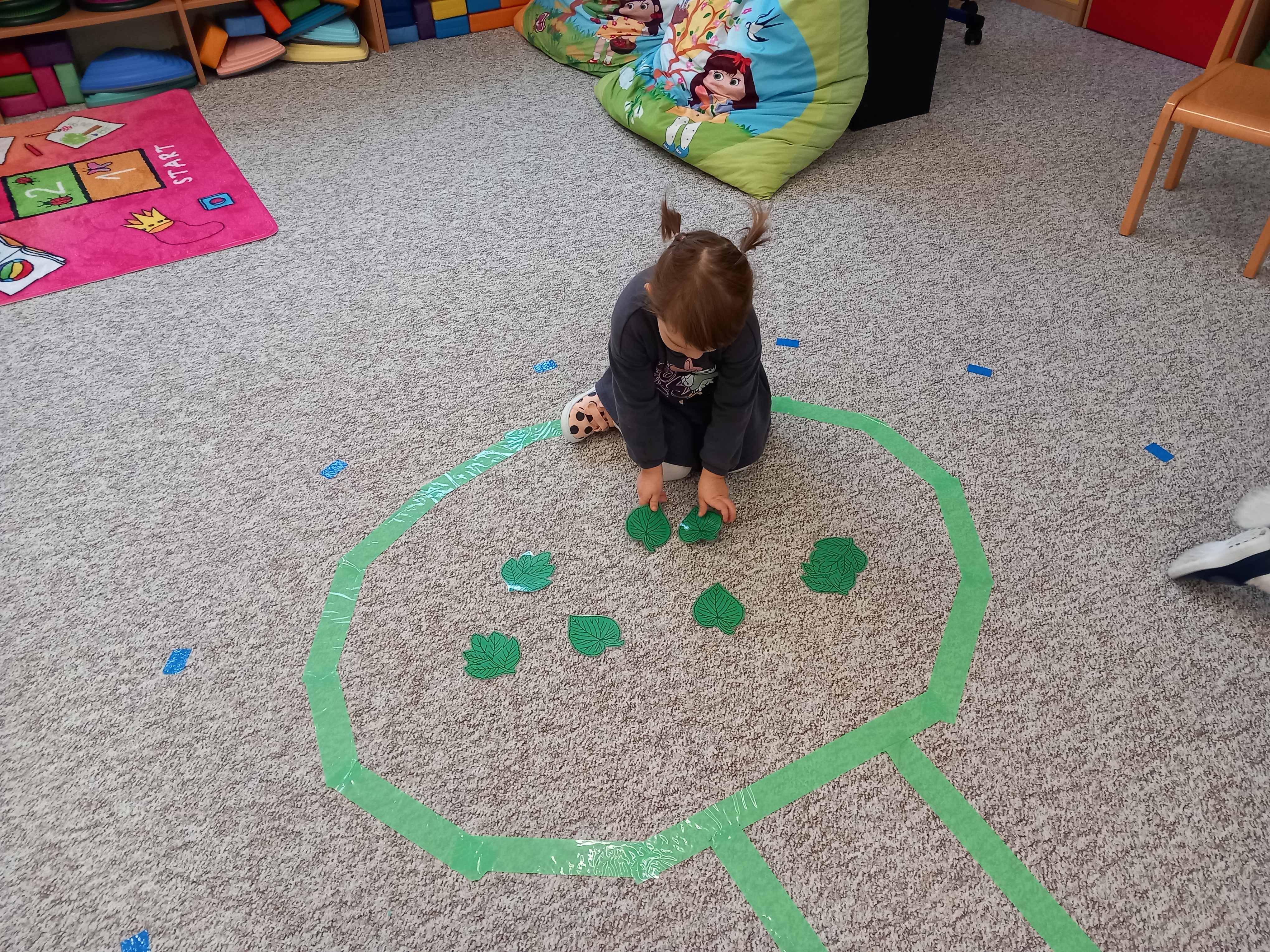 Děti třídily lístečky podle barev, vyhledávaly jednu konkrétní barvičku, zpívaly písničky ,