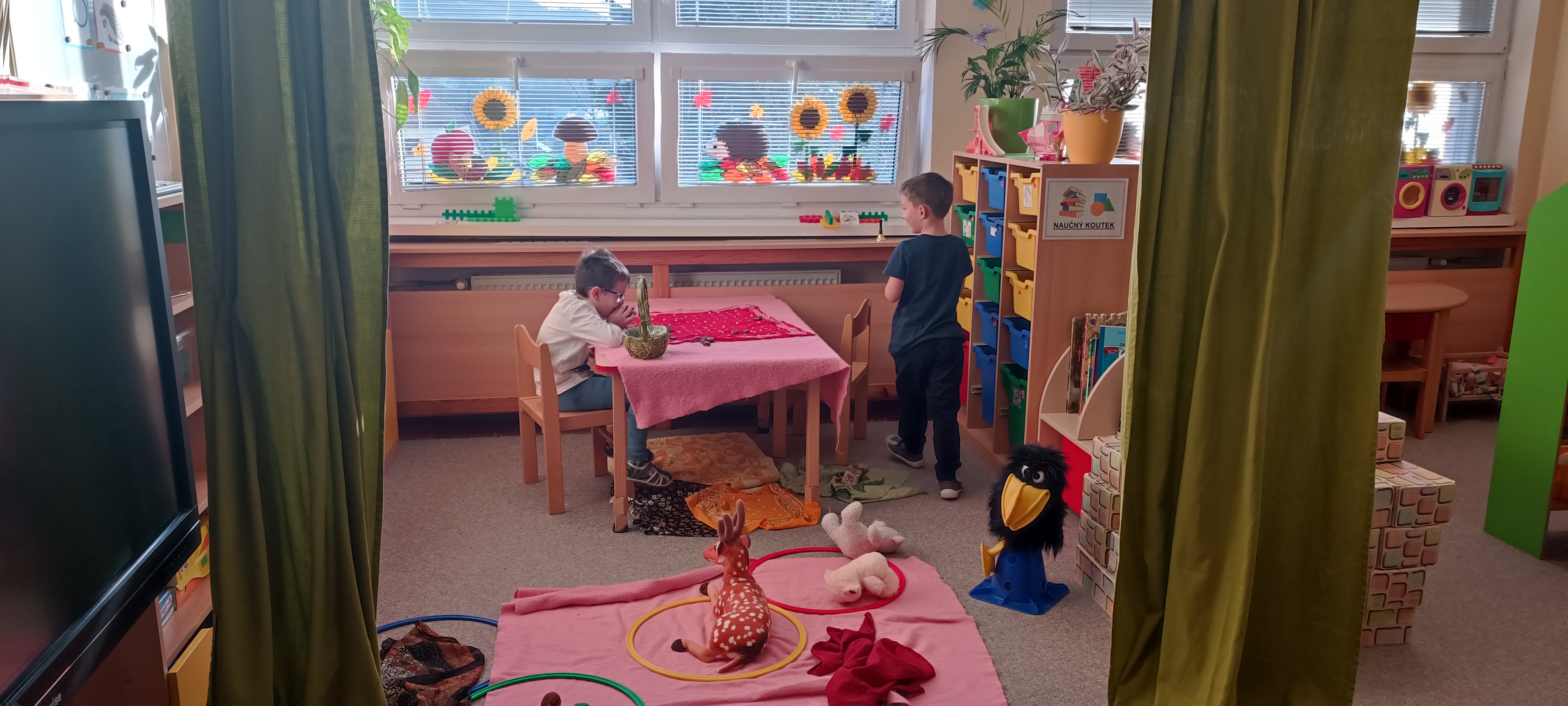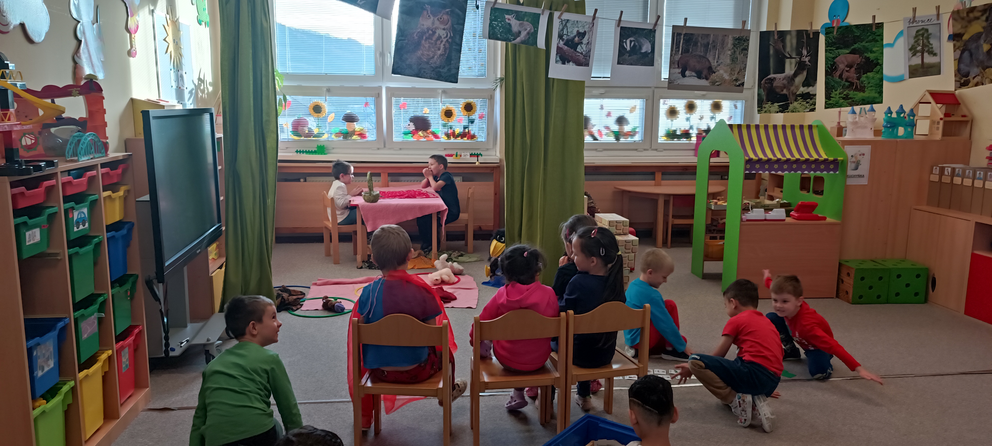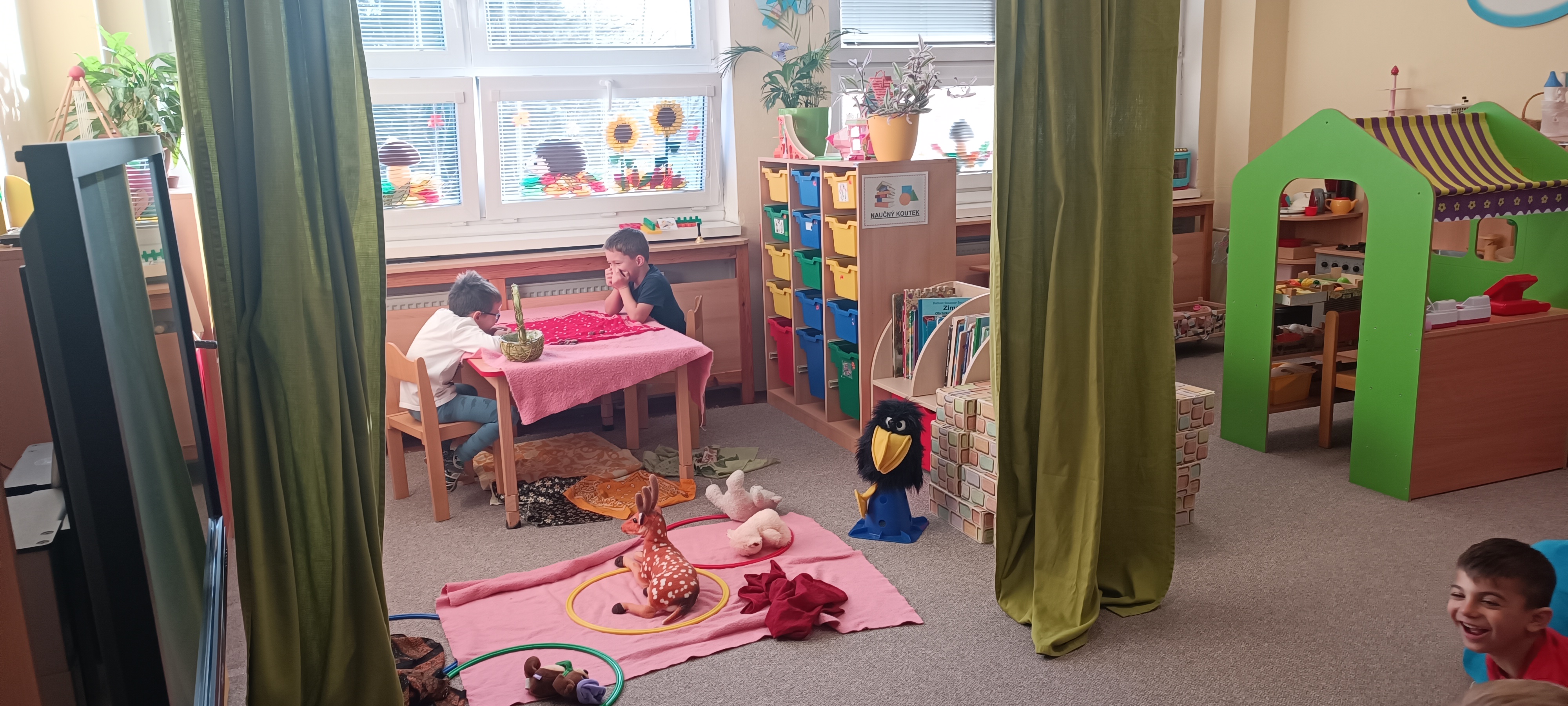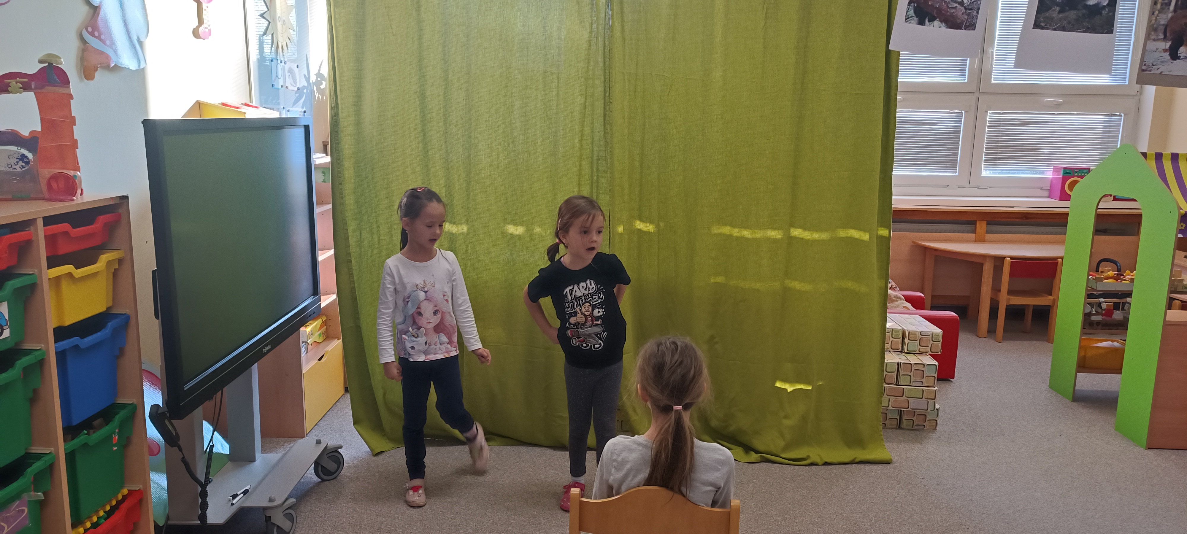 V našem divadélku si hrajeme pohádky o zvířátkách - kluci hrají holčičkám a ony pak klukům.
