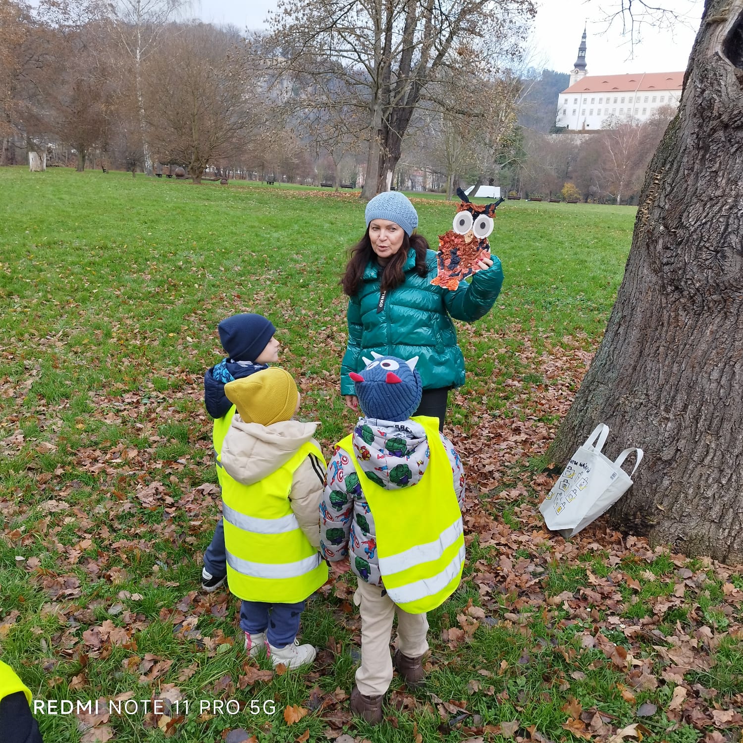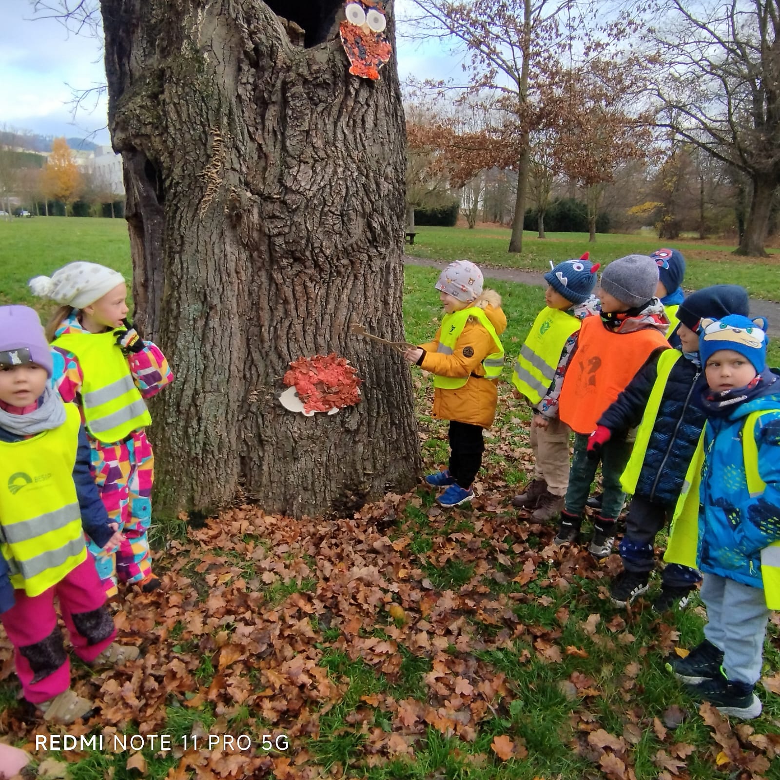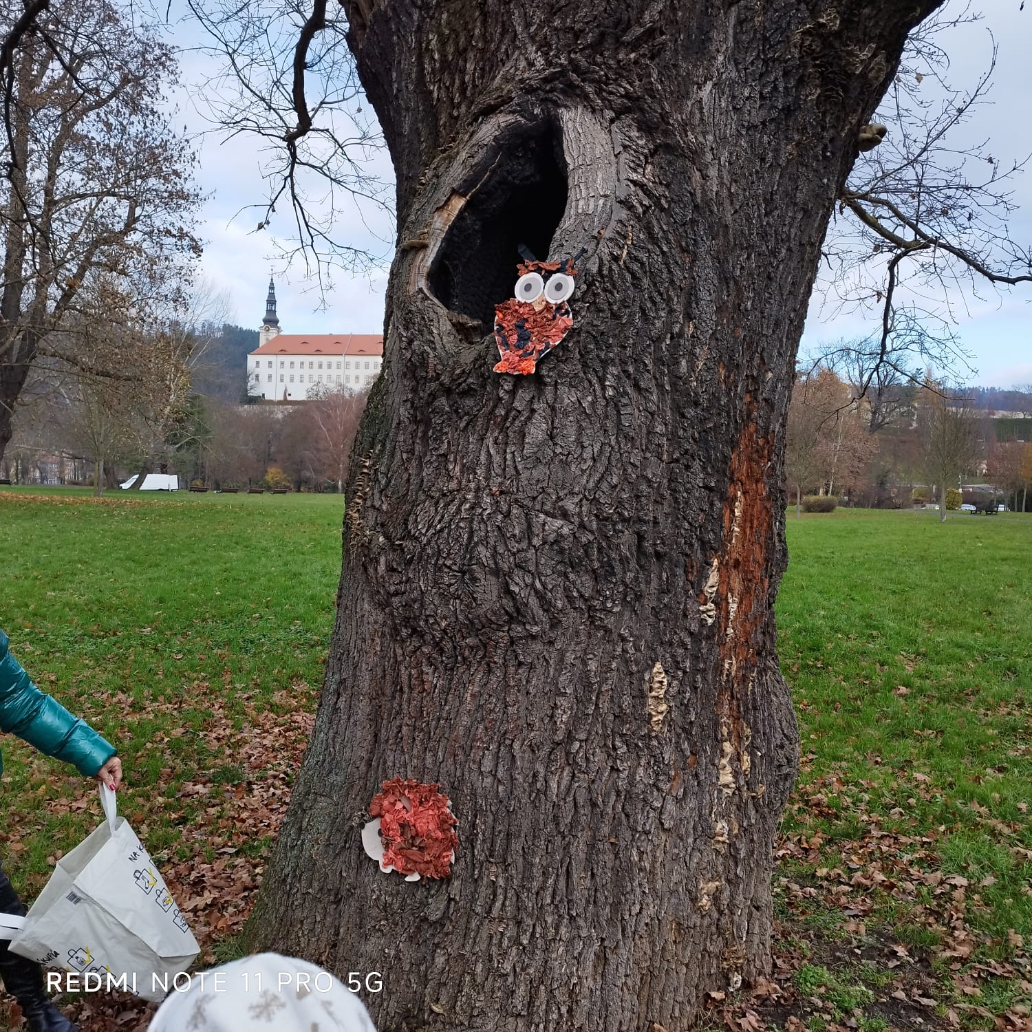 Vydali jsme se do lesa k vykotlanému dubu, kde bude mít hnízdo sova a ježek si ustele v listí.