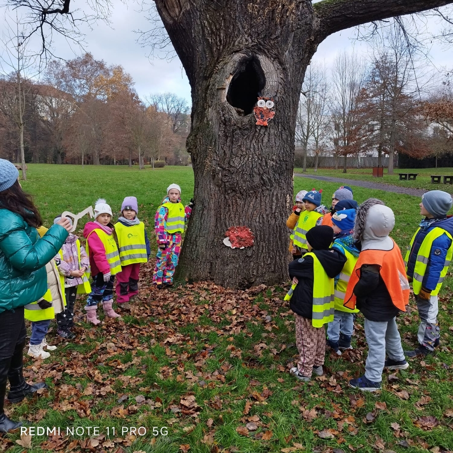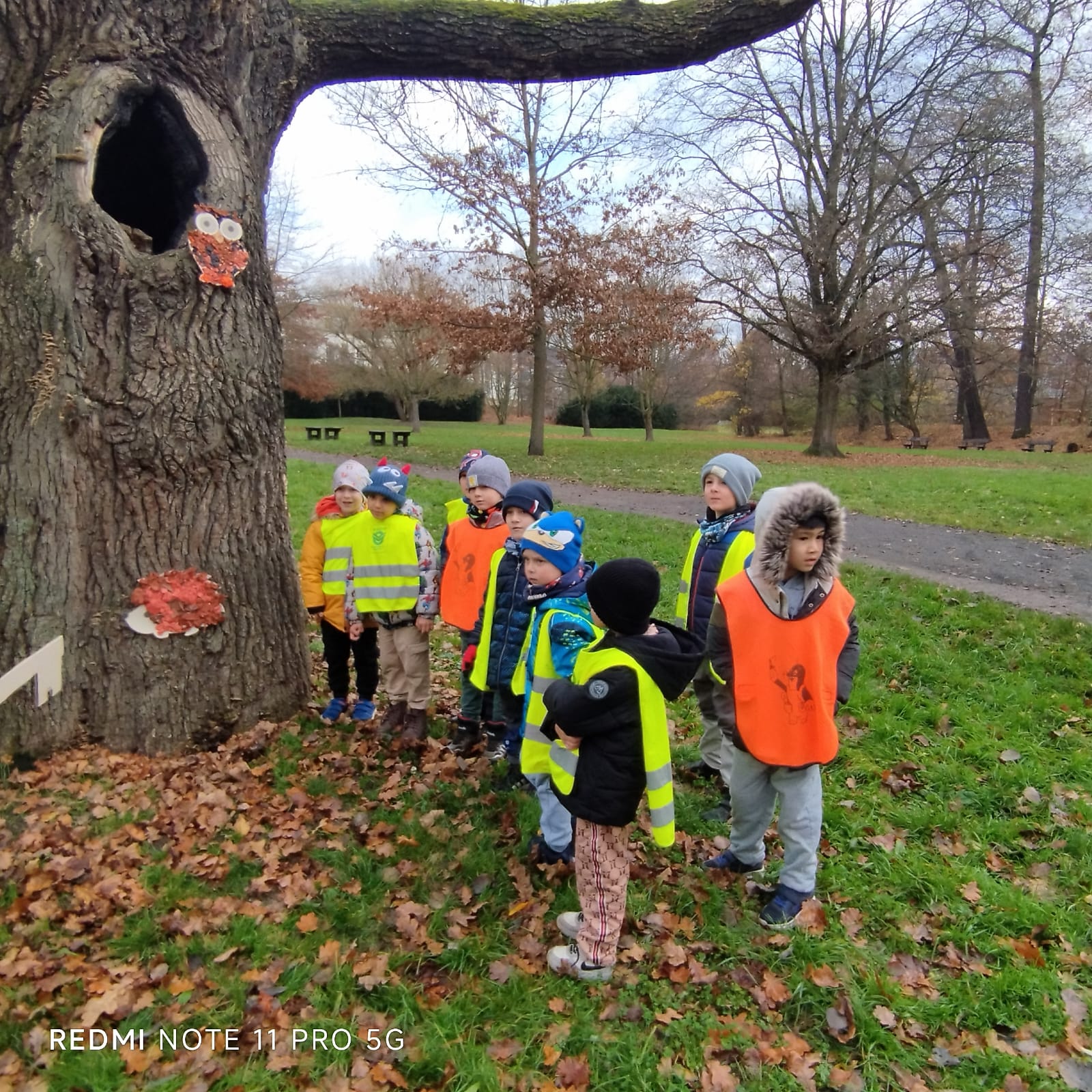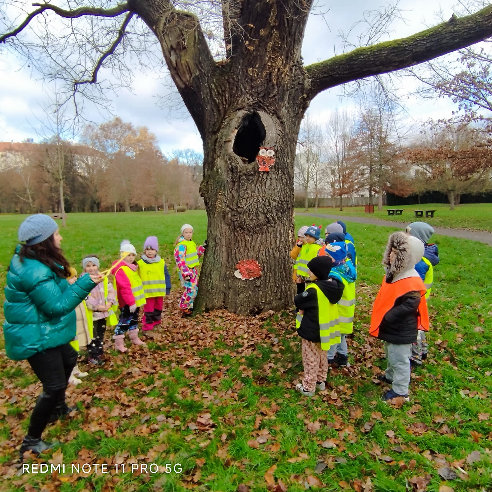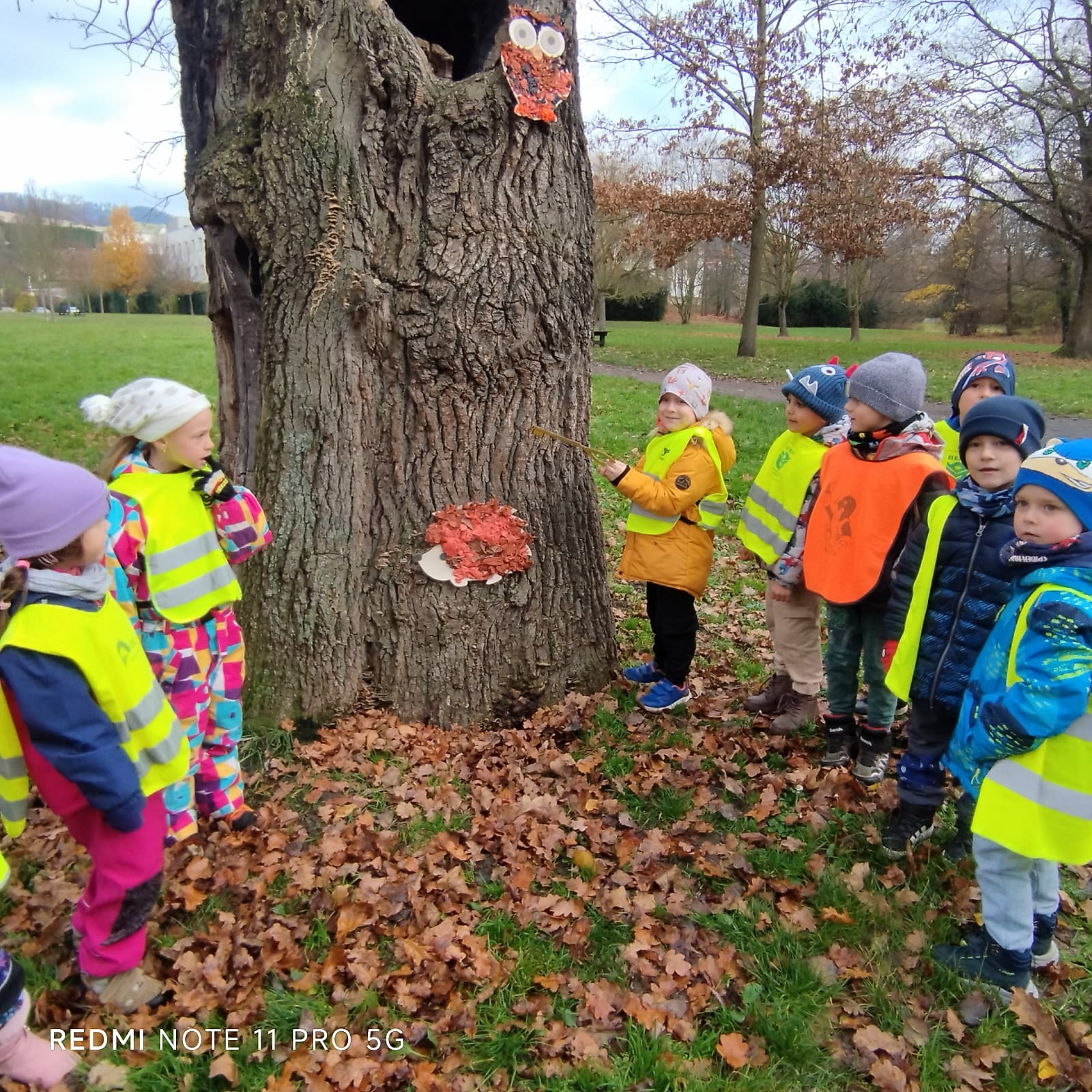 Vydali jsme se do lesa k vykotlanému dubu, kde bude mít hnízdo sova a ježek si ustele v listí.