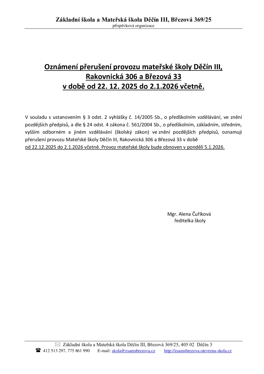 Oznámení přerušení provozu mateřské školy Děčín III, Rakovnická 306 a Březová 33 v době od 22. 12. 2025 do 2.1.2026 včetně. Doporučený