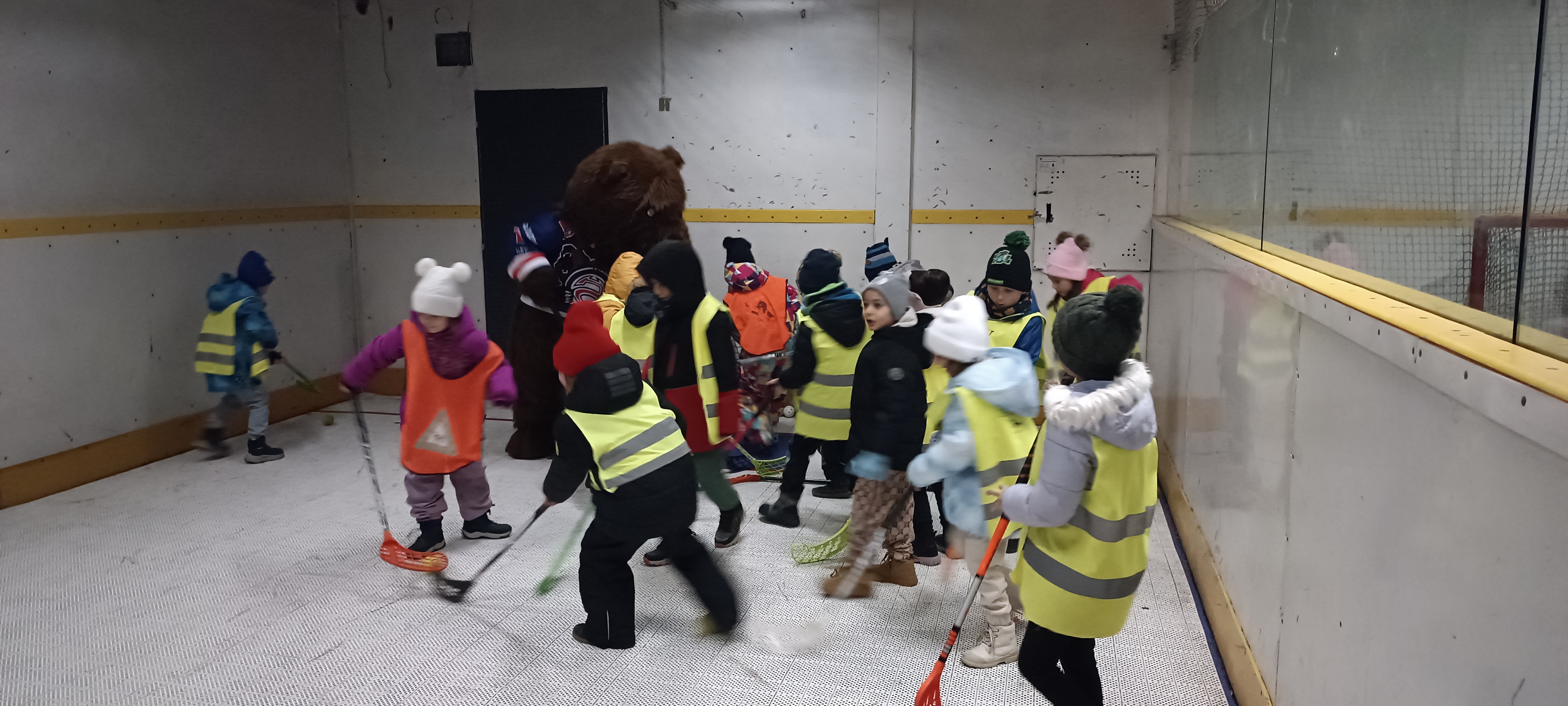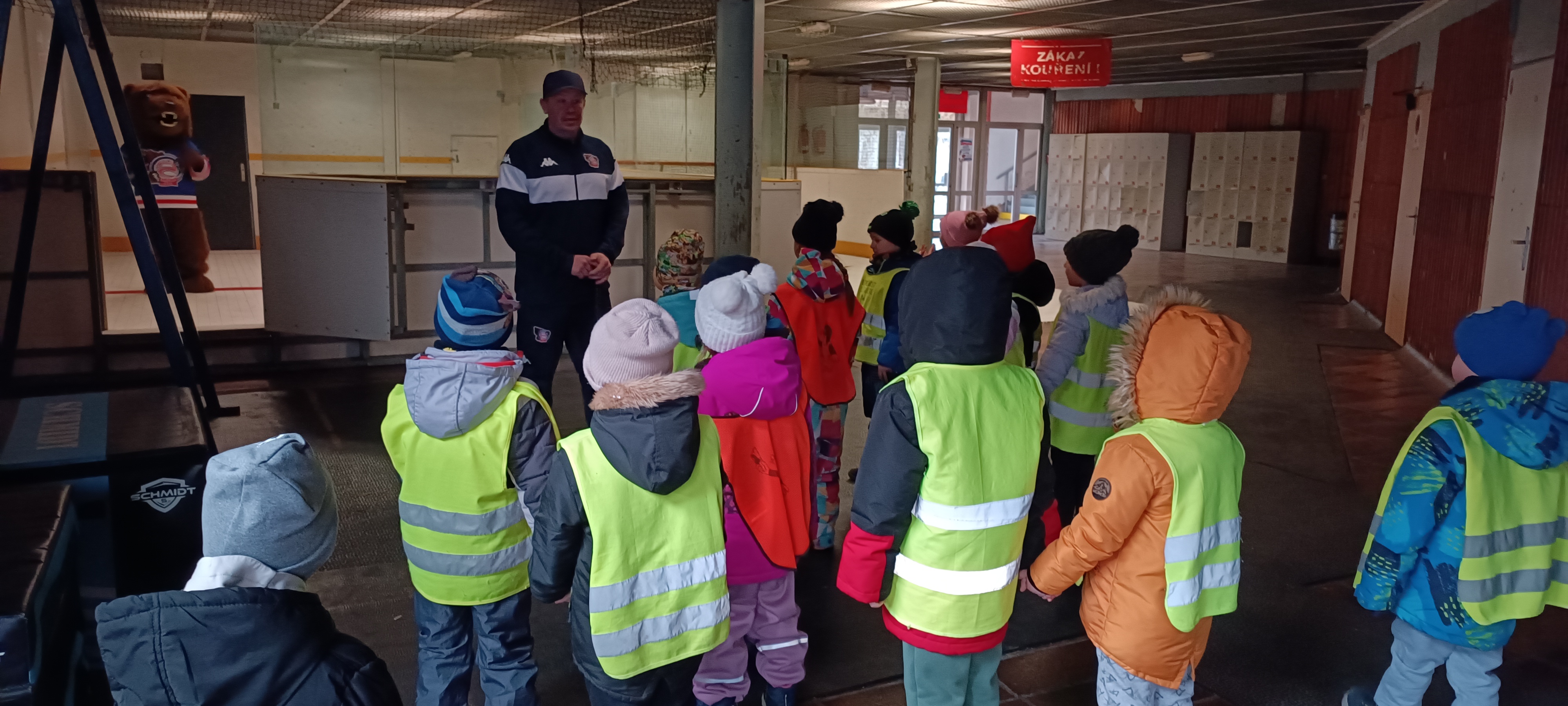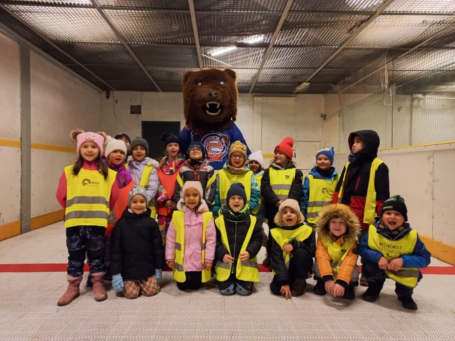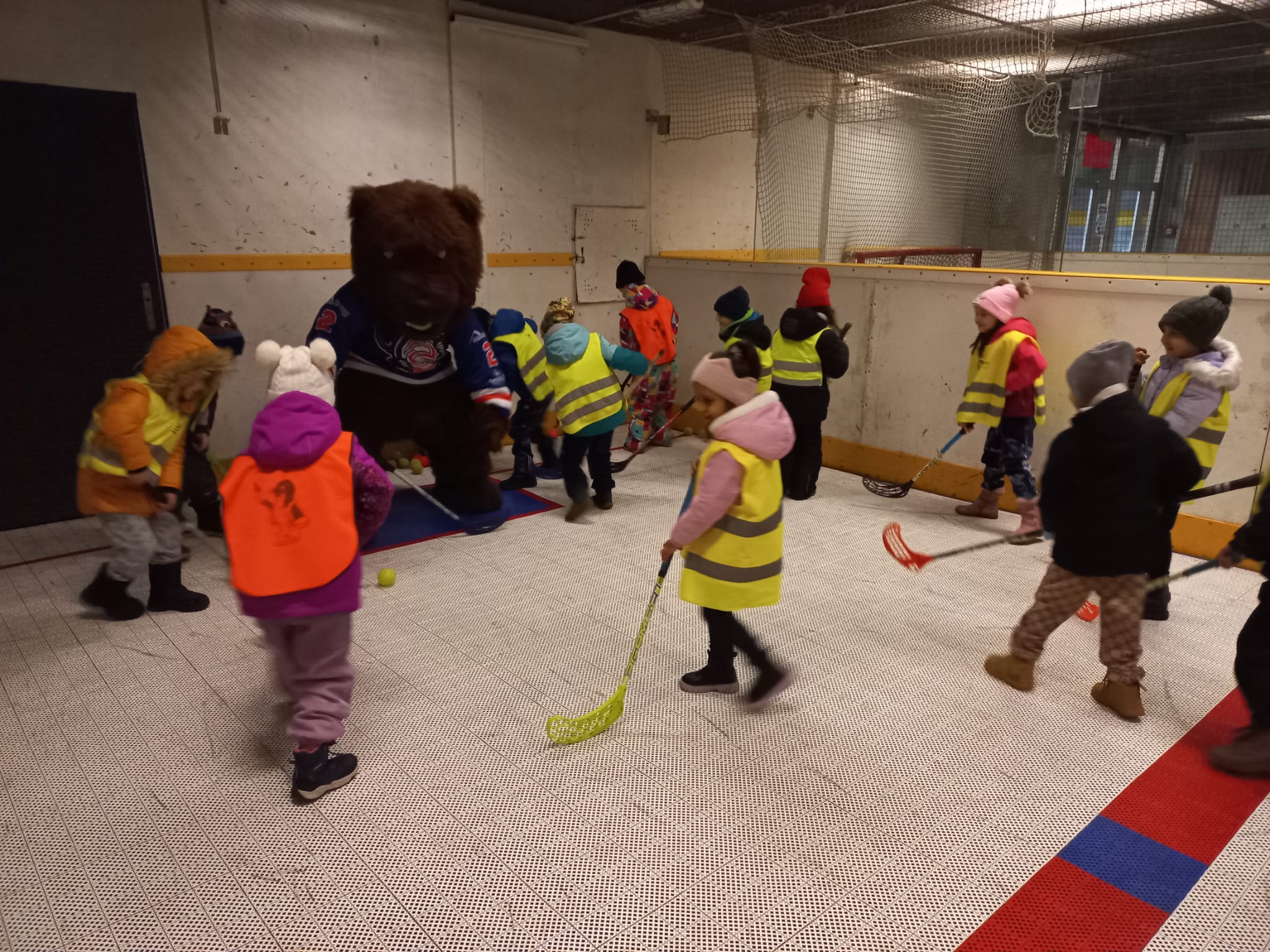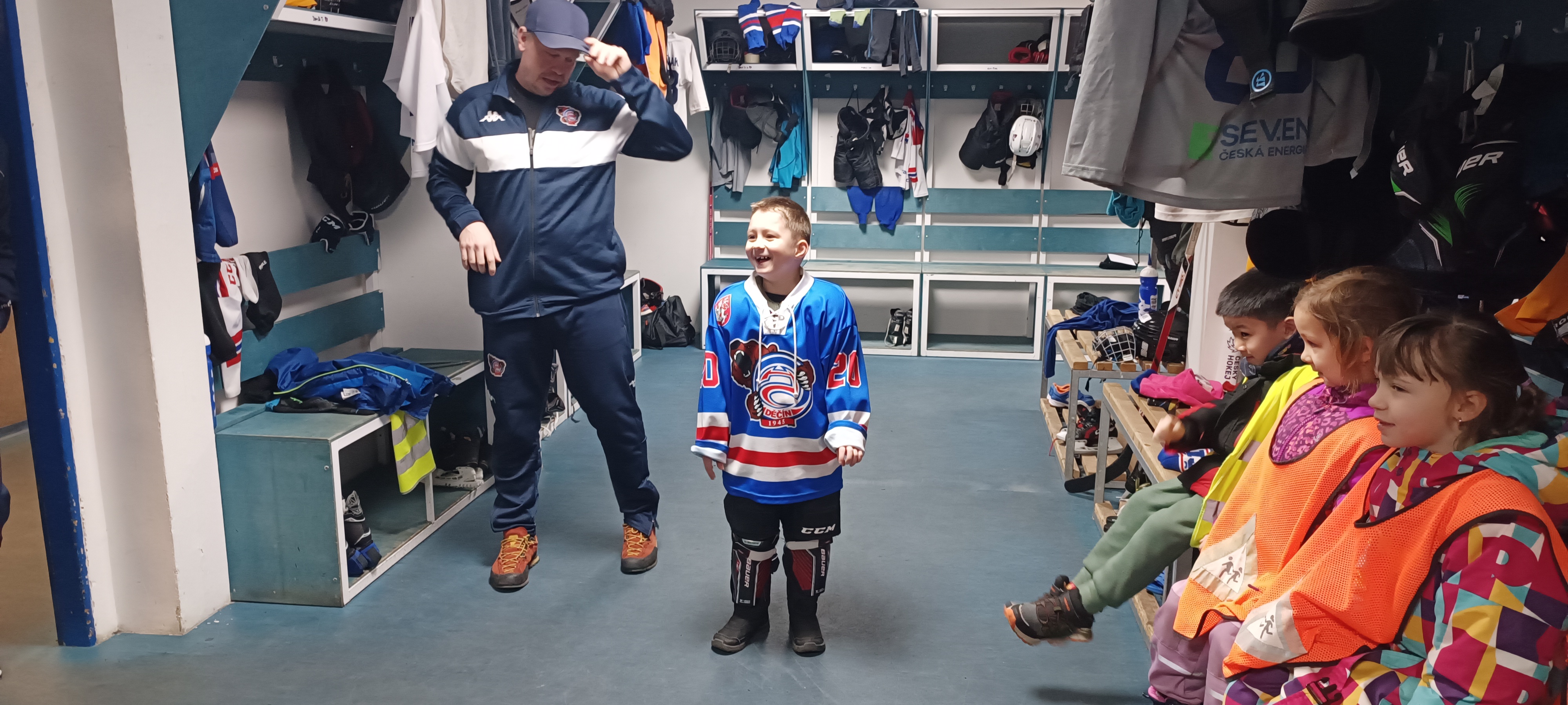 pozorovali jsme hokejisty při tréninku. Zacvičili jsme si v posilovně a nakonec jsme si zahráli hokej s medvědem - maskotem našich hokejistů.