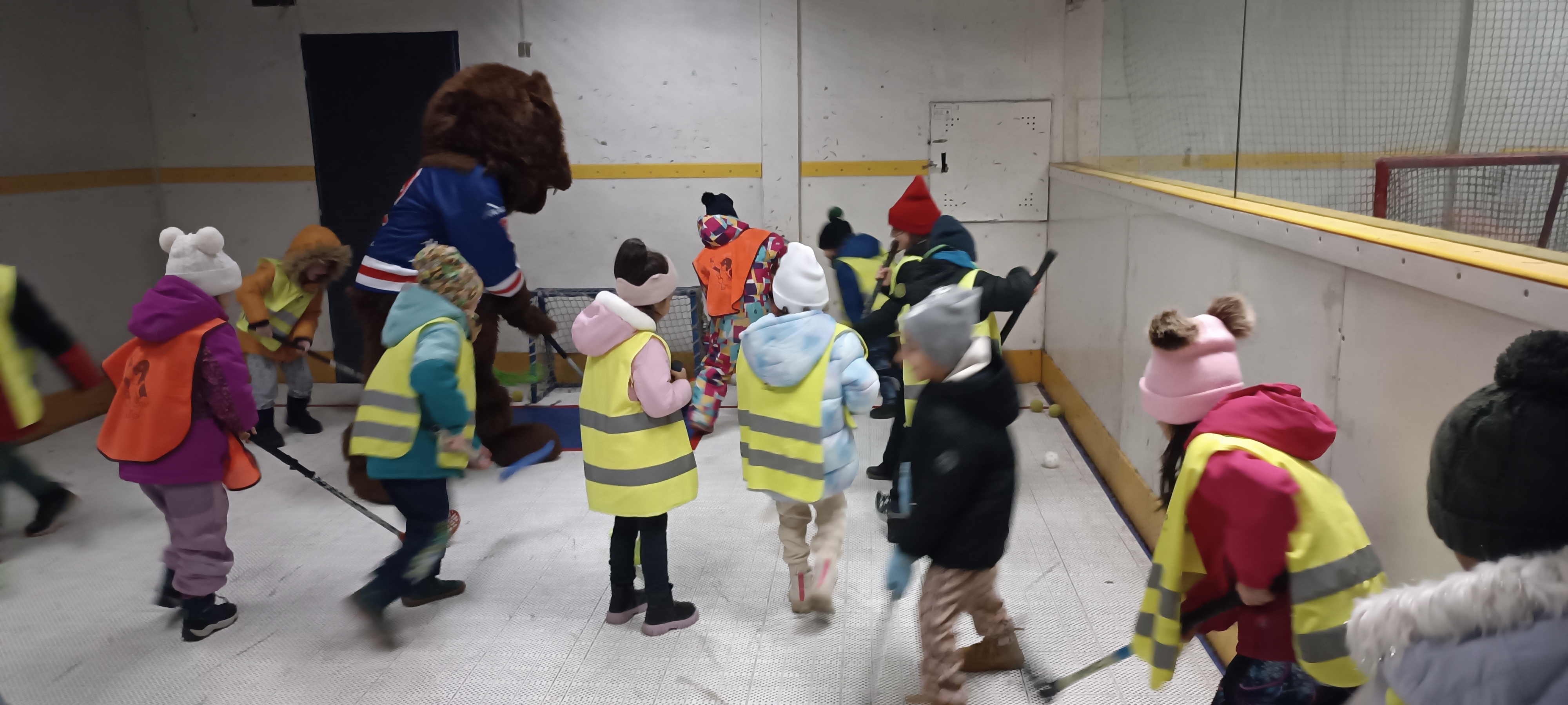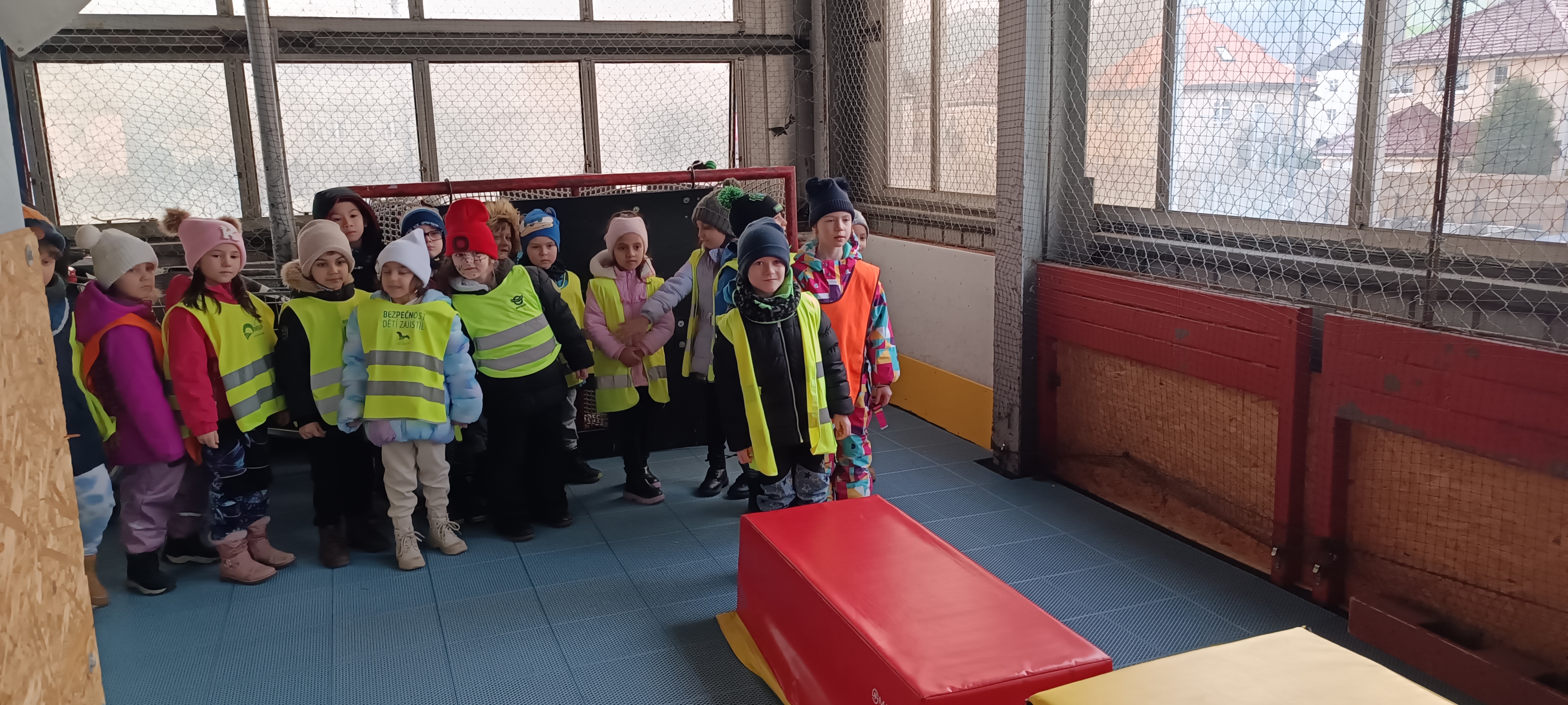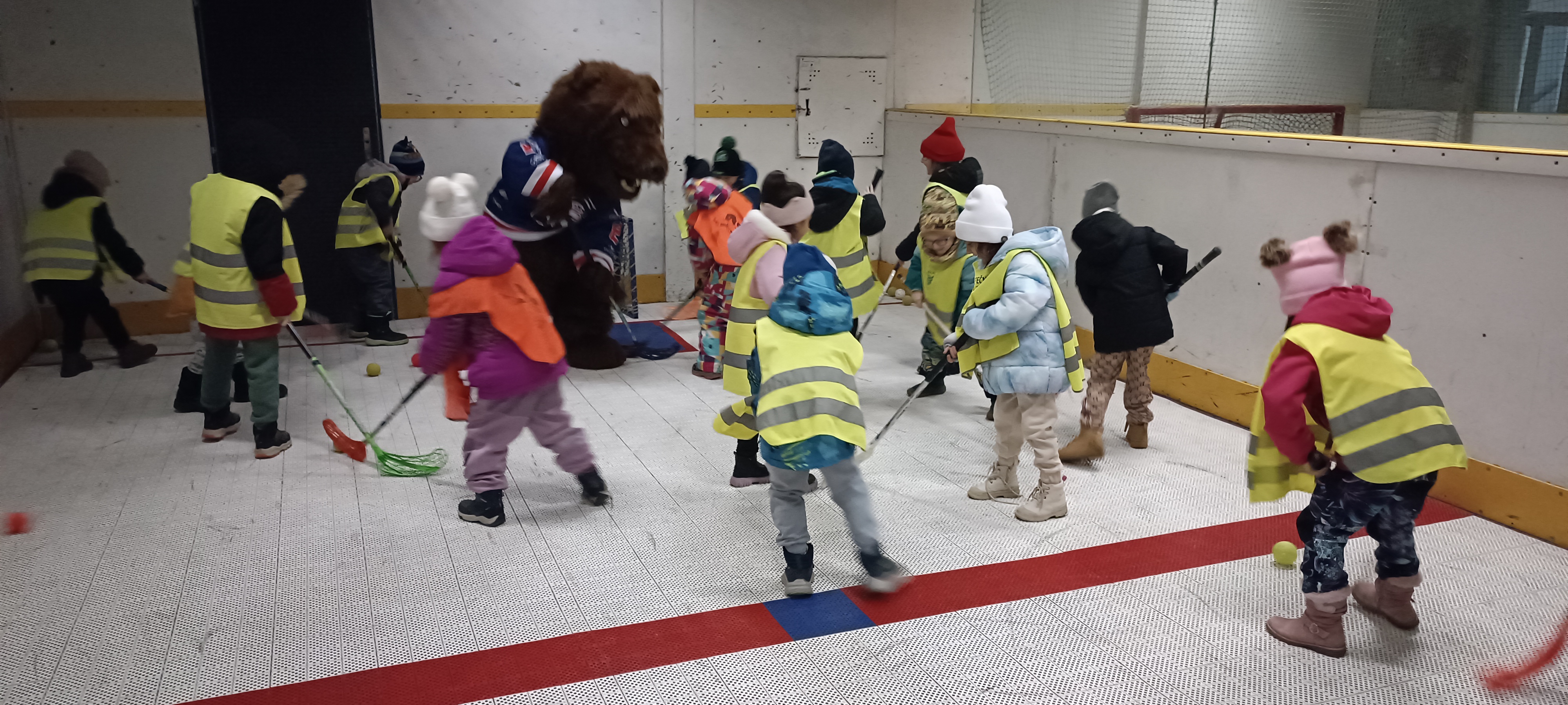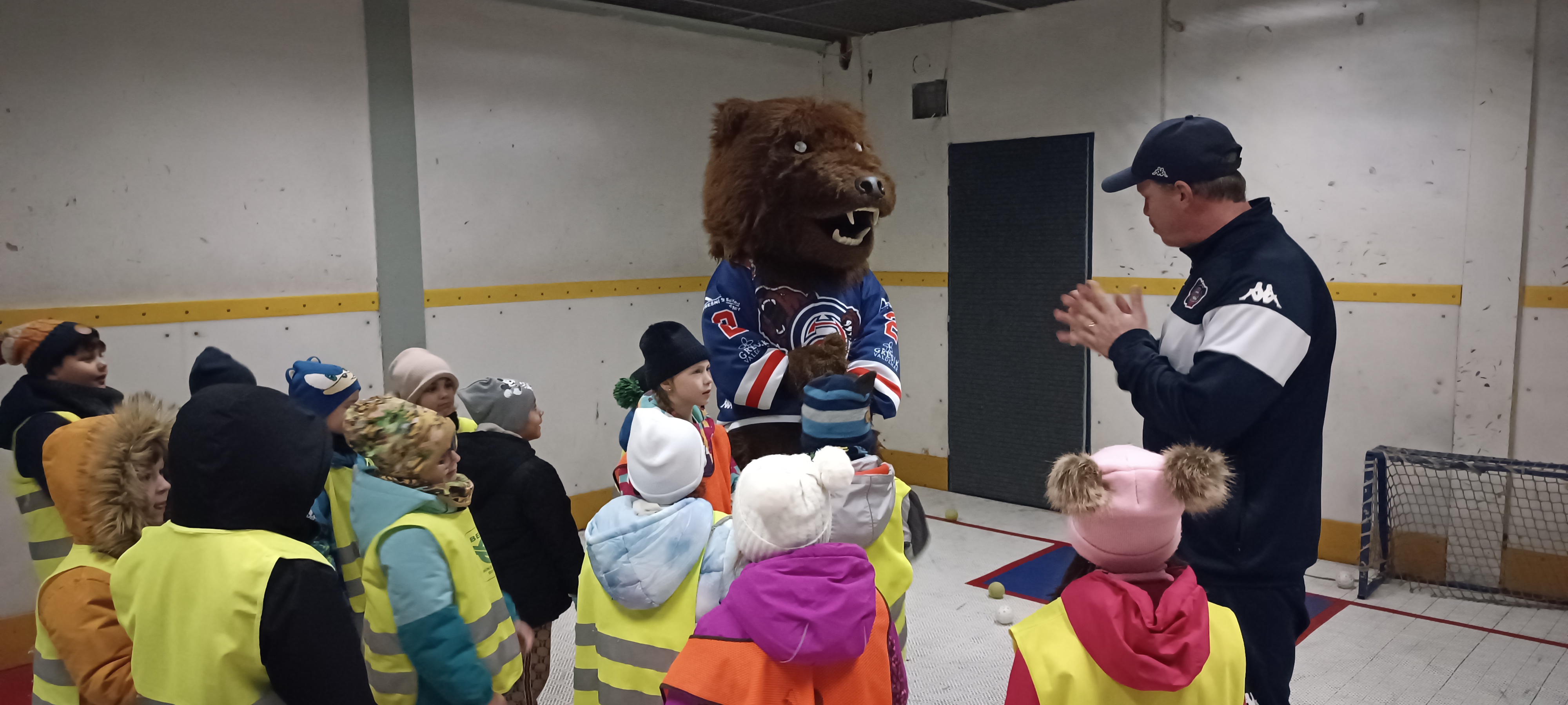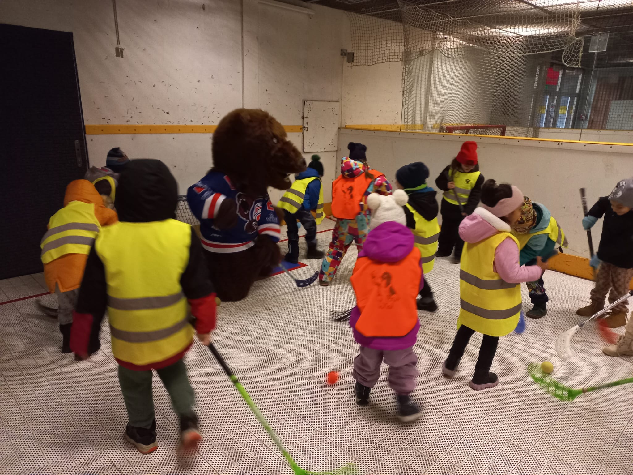 pozorovali jsme hokejisty při tréninku. Zacvičili jsme si v posilovně a nakonec jsme si zahráli hokej s medvědem - maskotem našich hokejistů.