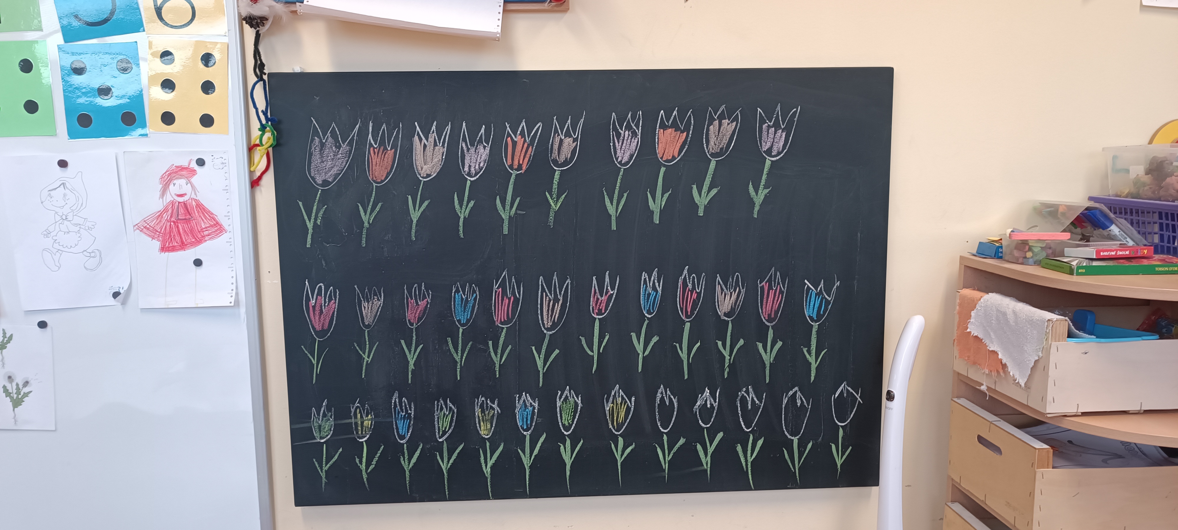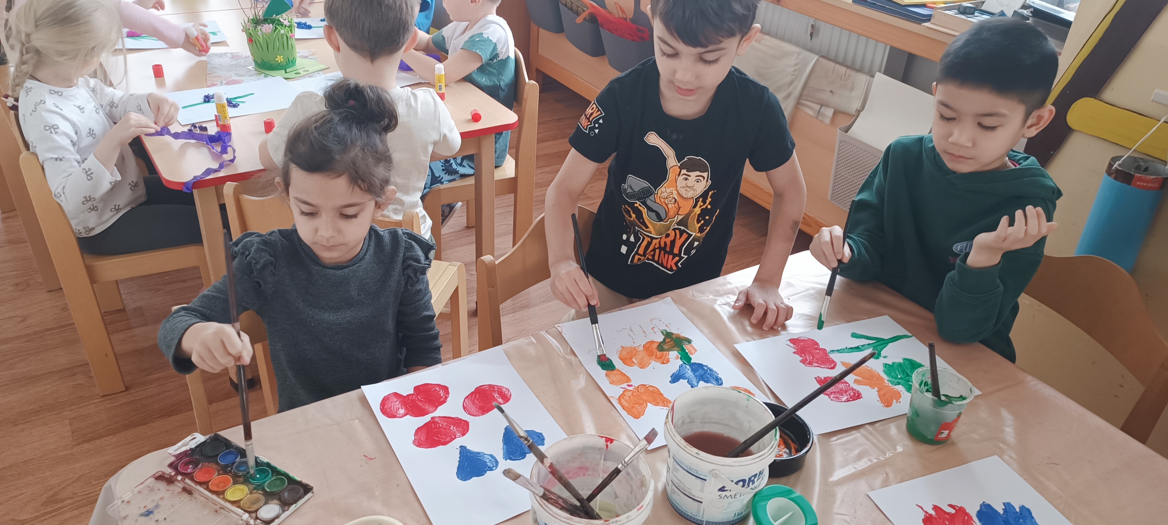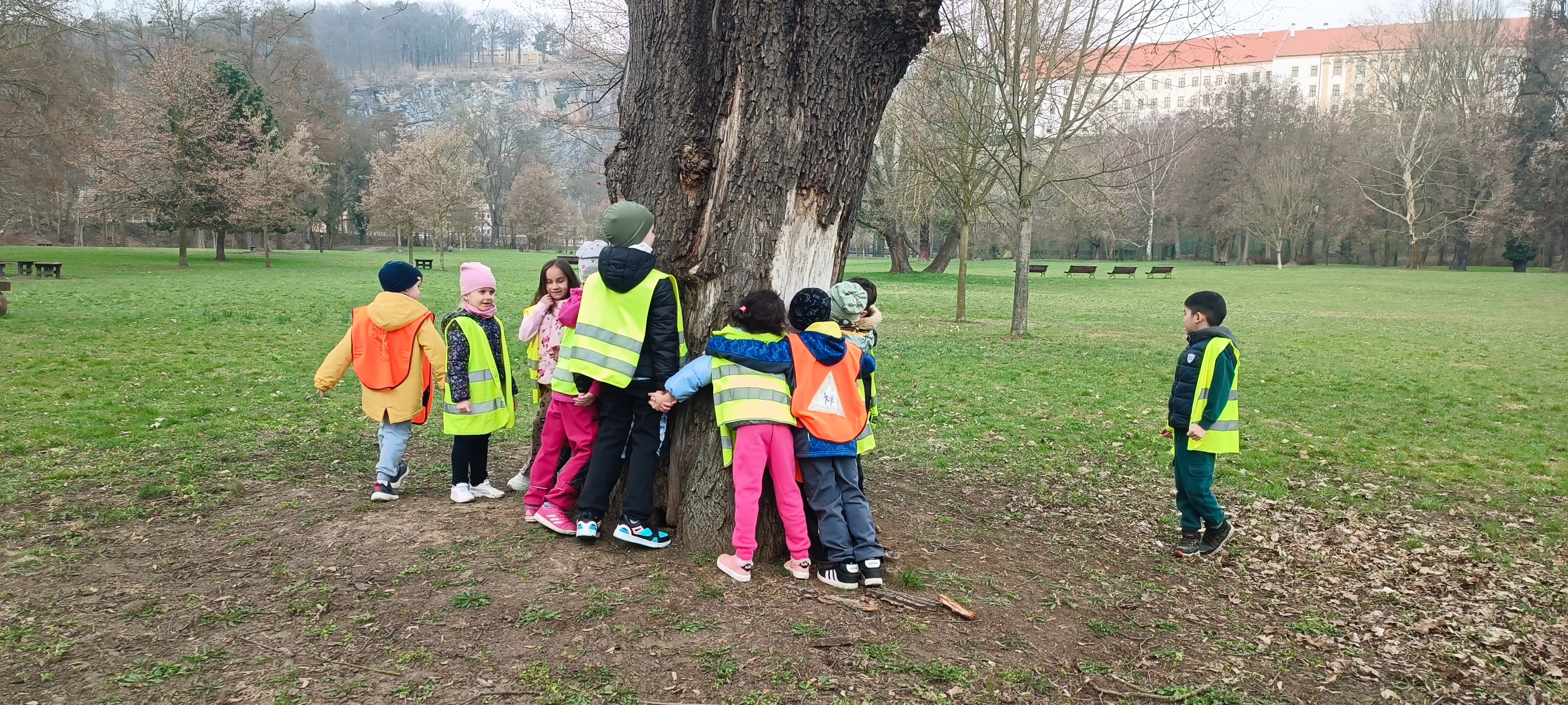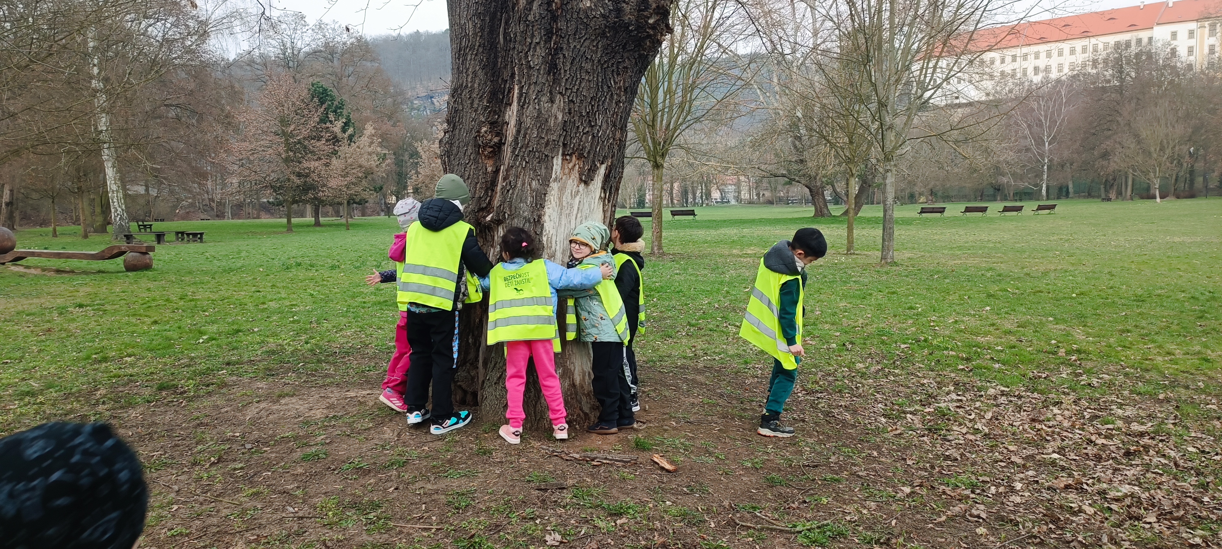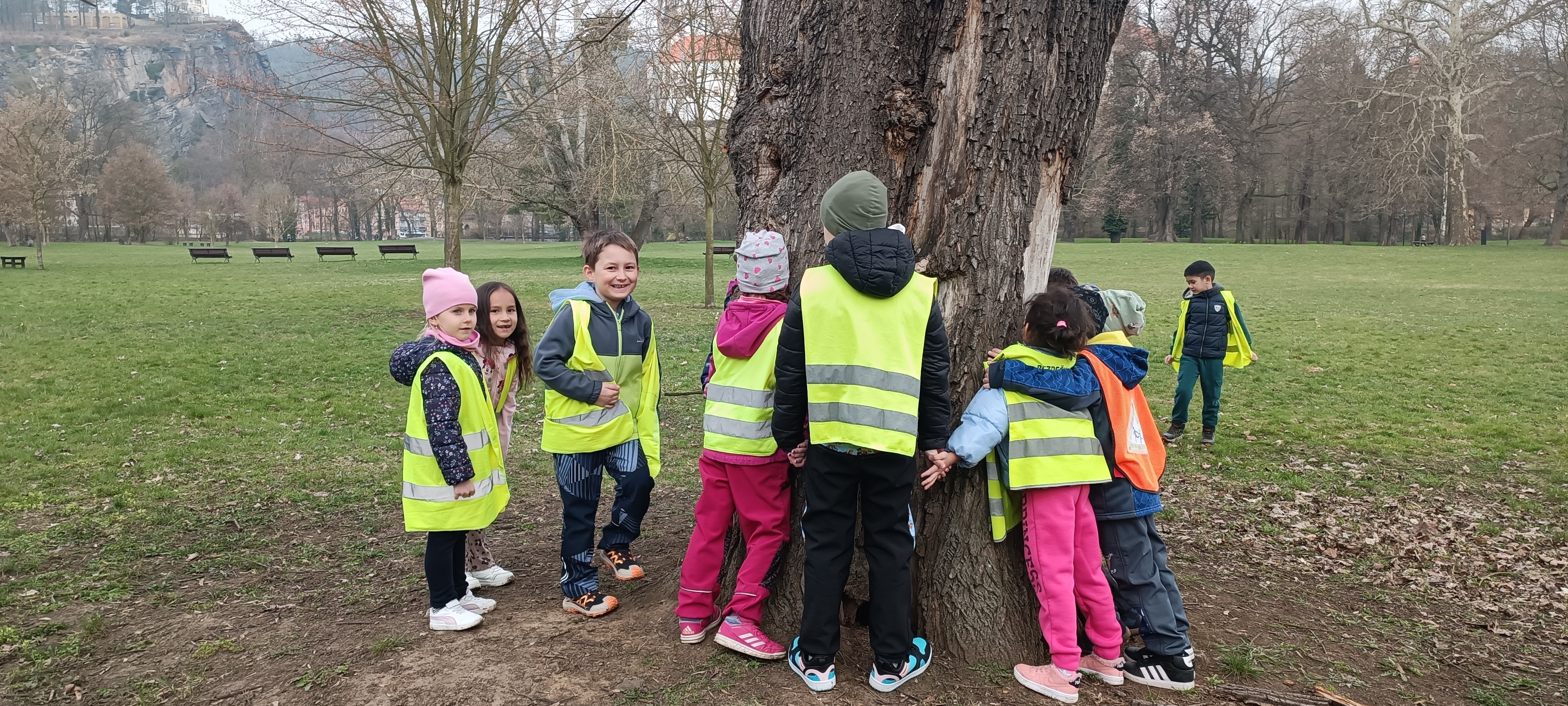 Malujeme jaro, zpíváme o něm a také jsme si vyšli k vykotlanému dubu, kde jsme na podzim zamkli les,